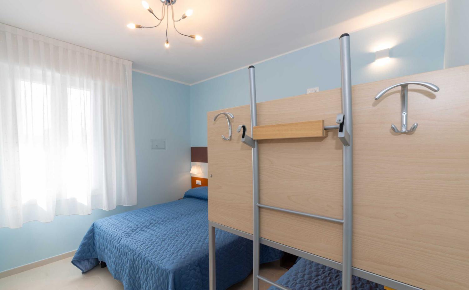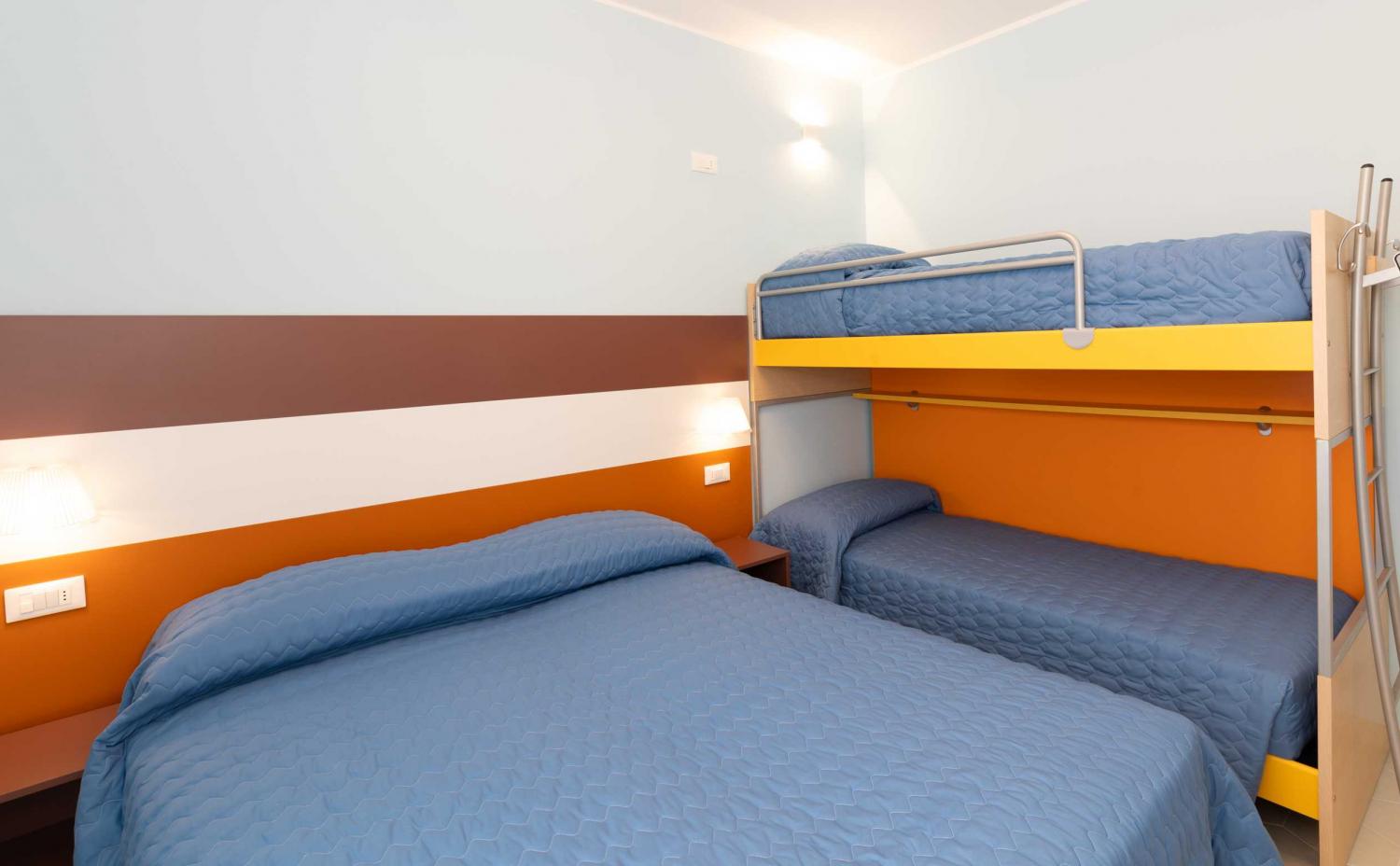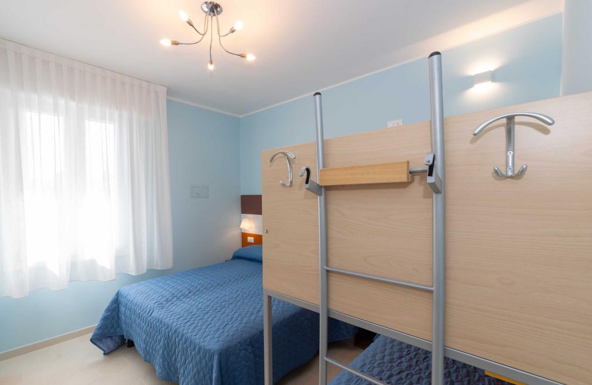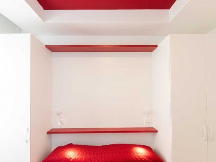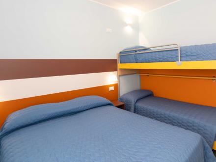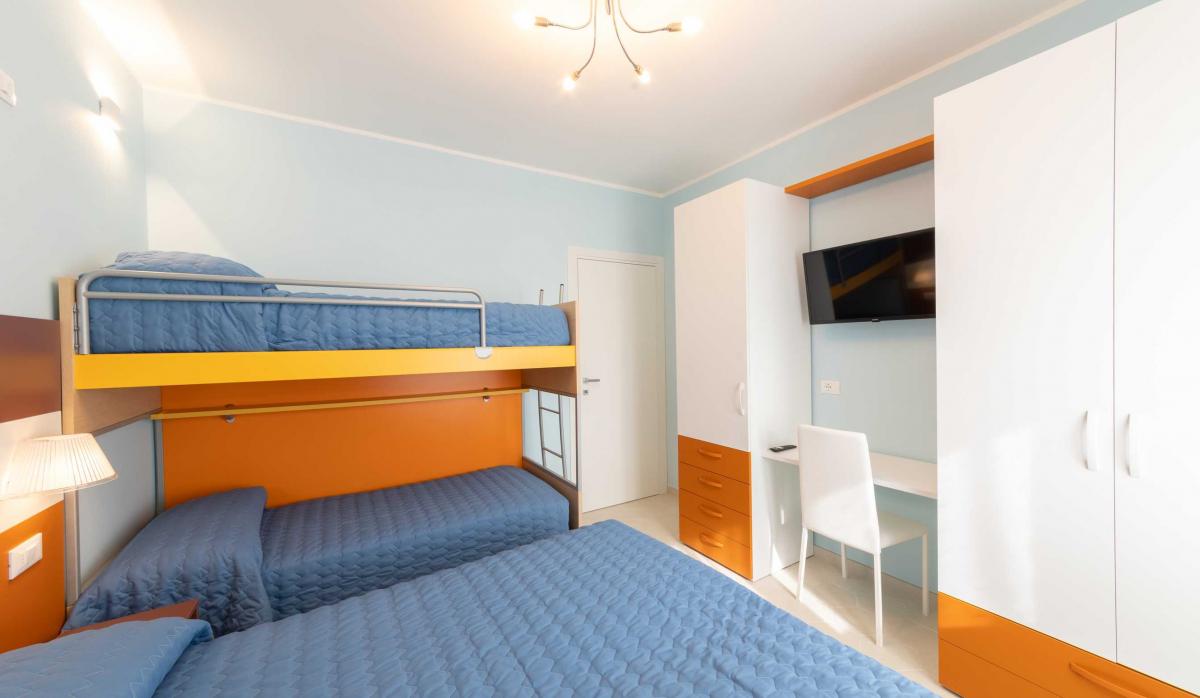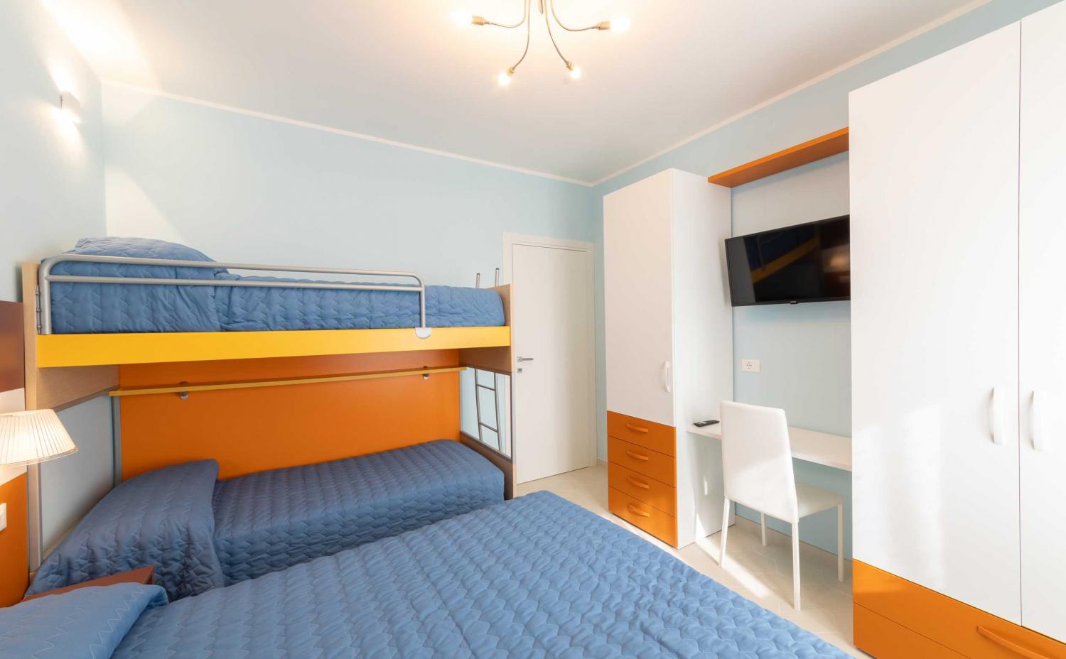 Camera da letto principale con letto matrimoniale e letto a castello accessibile con una scala in legno, inoltre sono presenti due armadi da cm 90 e cm 60, con relativi cassetti, scrittoio e TV color.